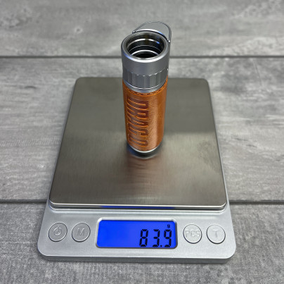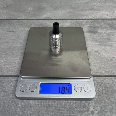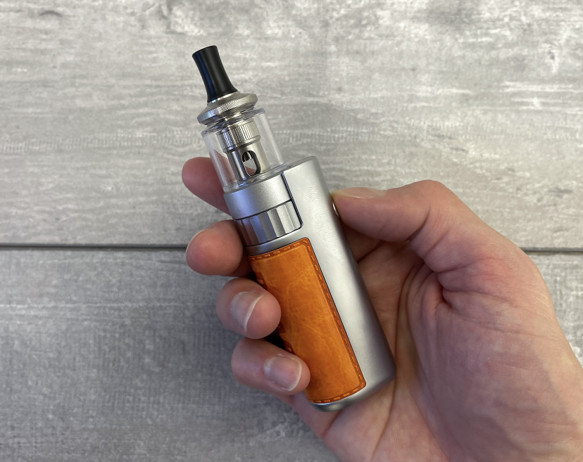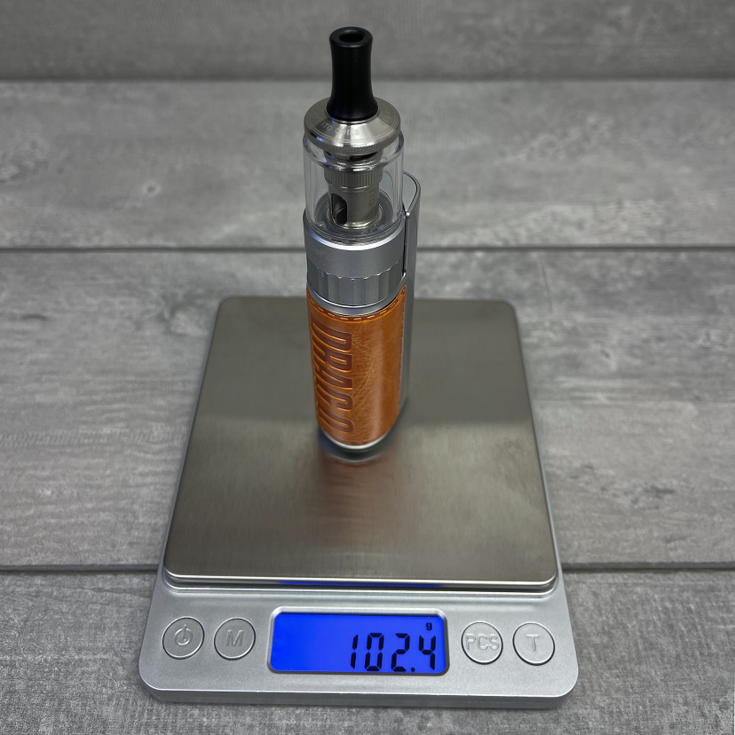 Вес батарейного блока получился 83.9 грамм, в то же время атомайзер достаточно легкий – всего 18.4. В ладони лежит уверенно (несмотря на размер), каким хватом его ни возьми, а кожа обеспечивает хорошую эргономику.